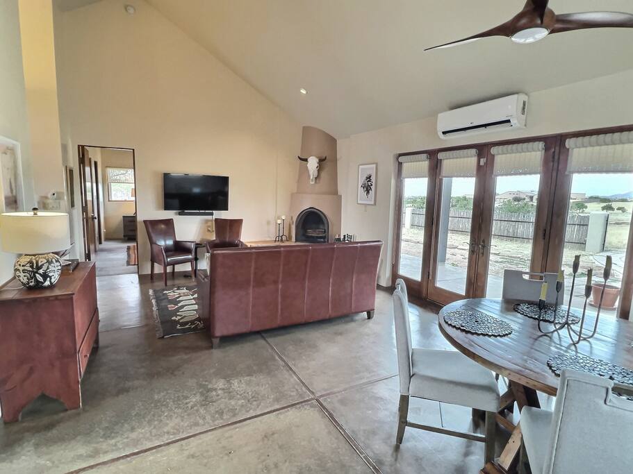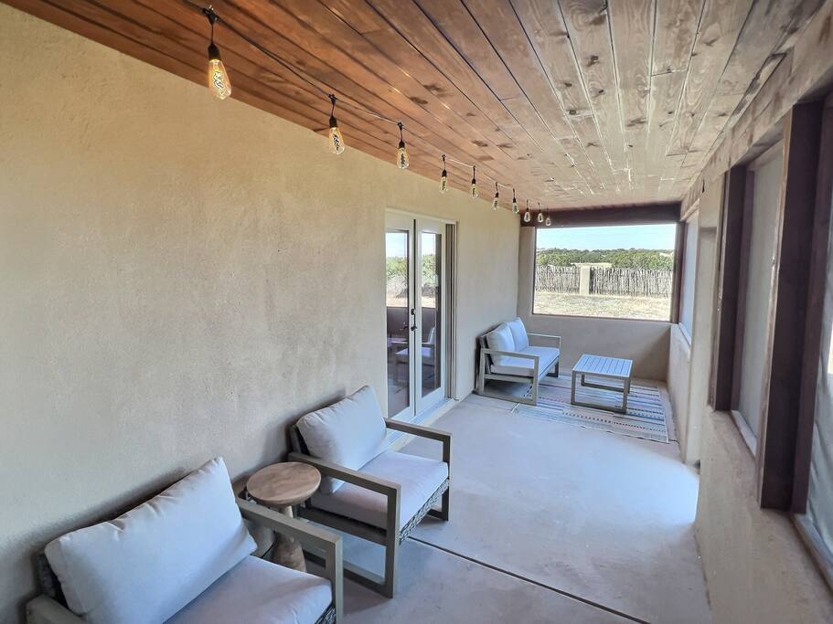 Vacation at Rancho del Viento. Experience its dark skies for stargazing, abundant wildlife, private arroyo, and peaceful spaces. The Rancho sits on the edge of the Galisteo Basin, and the center of Santa Fe Plaza is an easy 15 mile drive. Casa Arroyo is a perfect balance of Santa Fe city access and the wide open lands of New Mexico's outdoors. Enjoy the large ensuite King bedrooms, a spacious living area with a traditional kiva fireplace, and a full custom kitchen. Stargaze or sunbathe in these lovely outdoor living spaces, or slip out the back gate onto over 4,000 acres of the Galisteo Basin for walking, hiking & cycling.